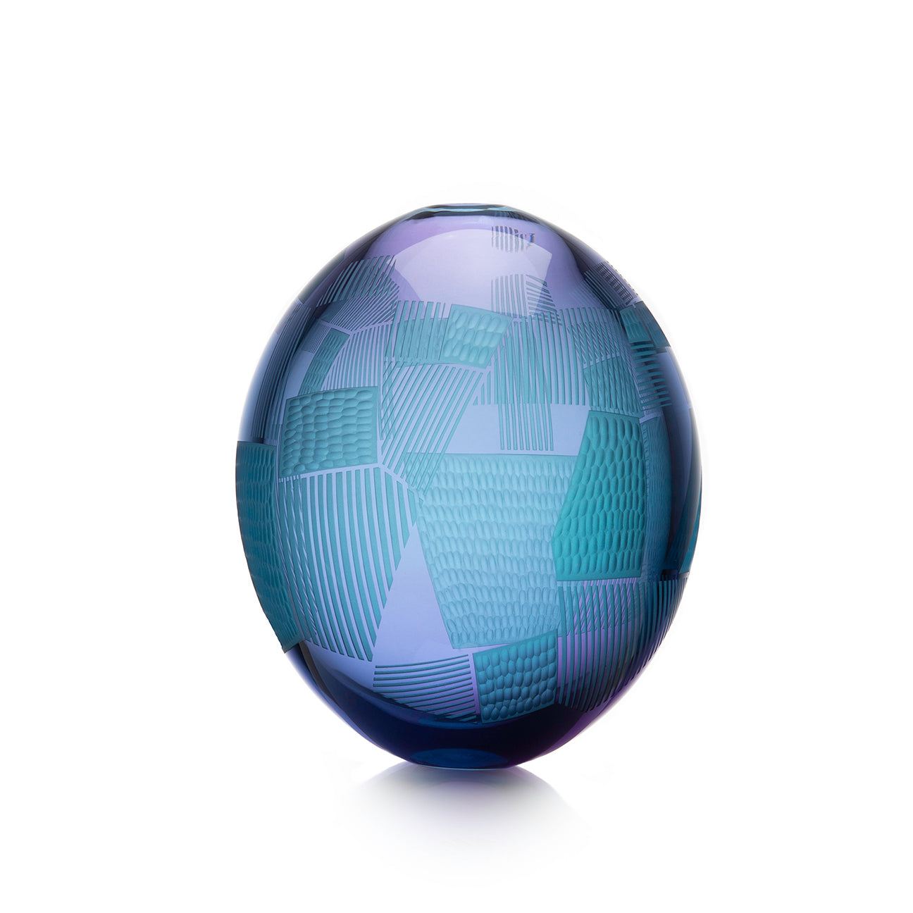 A vibrant blue glass ovoid sphere overlayed with transparent lilac glass.