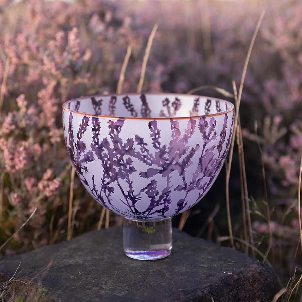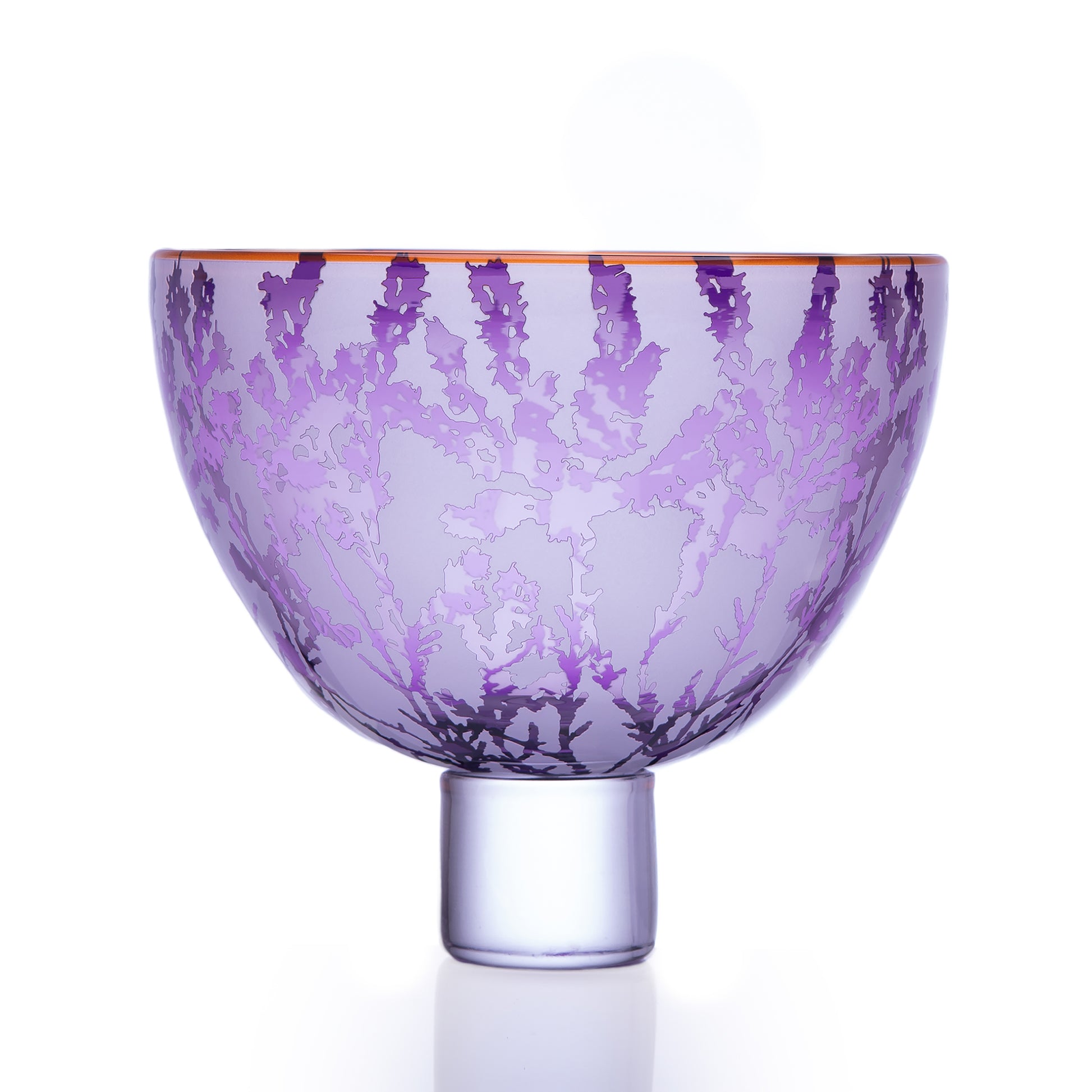 Hand blown, engraved glass, a deep purple bowl with a warm gold lip wrap.