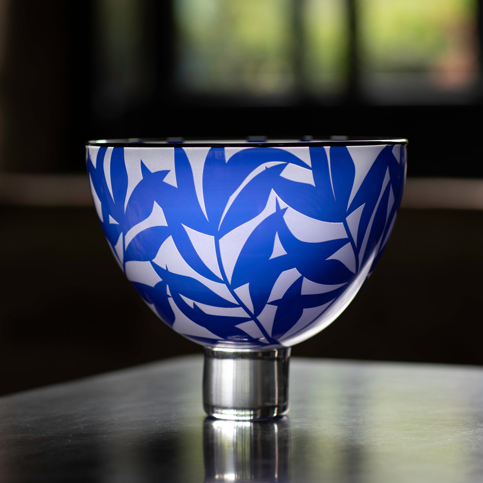 This engraved bowl is inspired by nature's elemental beauty. The repetition of a single leaf gives this bowl a strong vivid design. Expertly hand-blown by glassmaker Stephen Gillies, the design is engraved by Kate Jones.